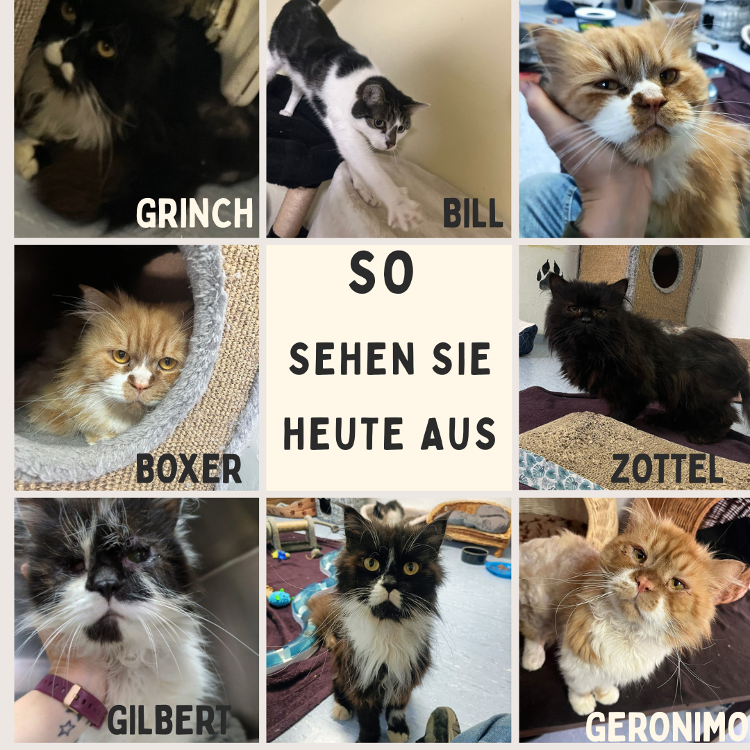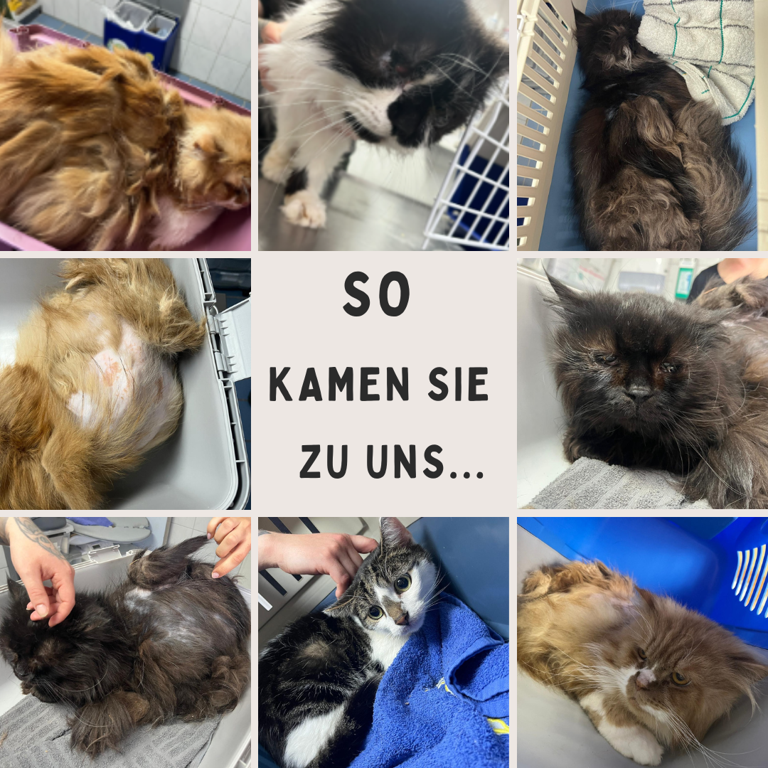 Auf den Bildern seht ihr, wie die Katzen aussahen, als sie zu uns kamen - und die tollen Fortschritte, die sie in der Zwischenzeit schon gemacht haben. An dieser Stelle ein wichtiger Hinweis: Bitte verzichtet auf negative Kommentare zu den früheren Haltern. Die Katzen sind jetzt in Sicherheit, werden liebevoll versorgt – und wir möchten den Blick nach vorne richten!
