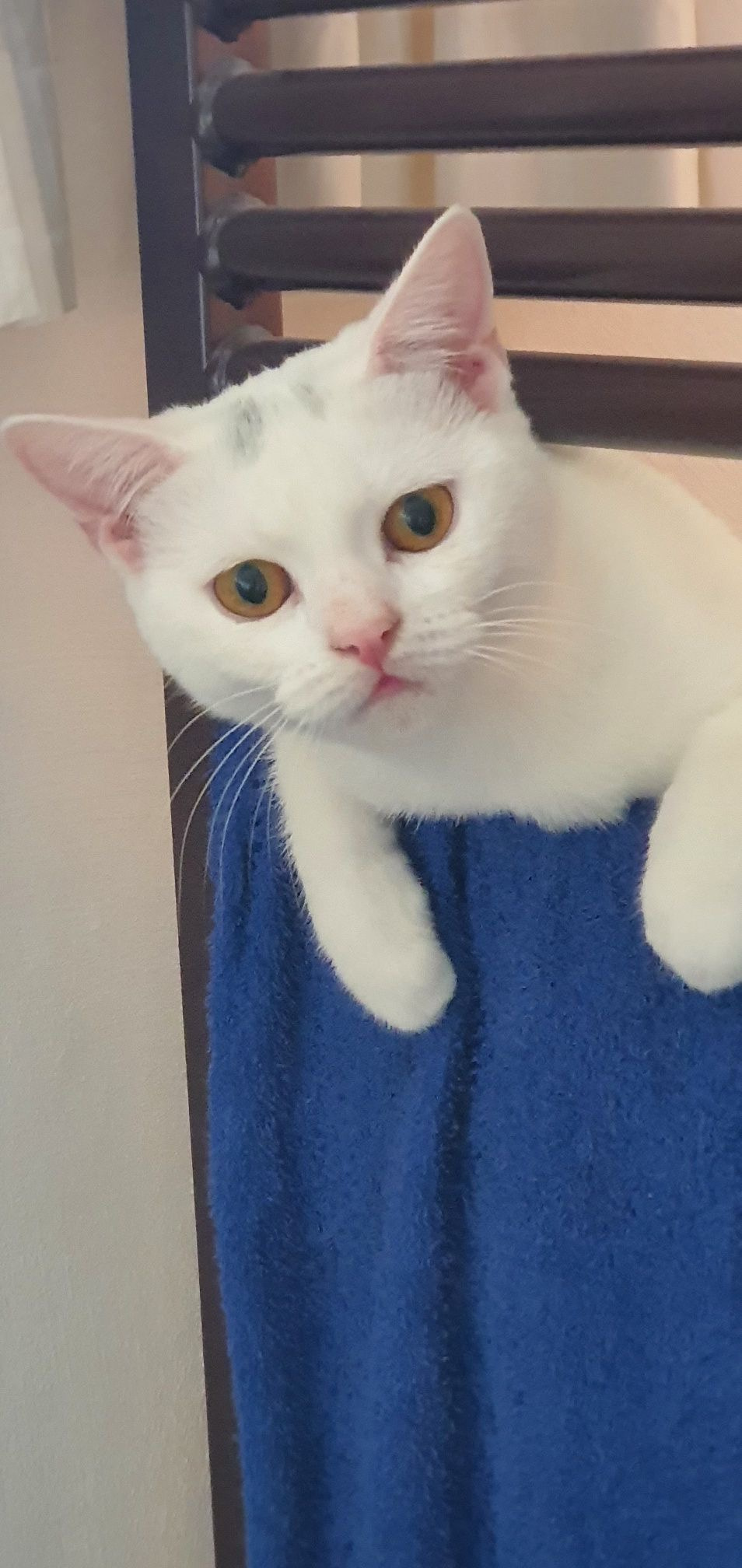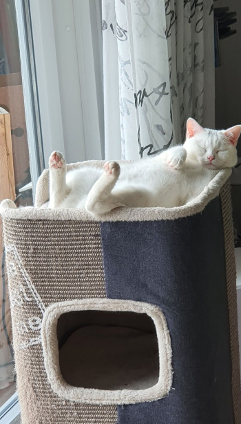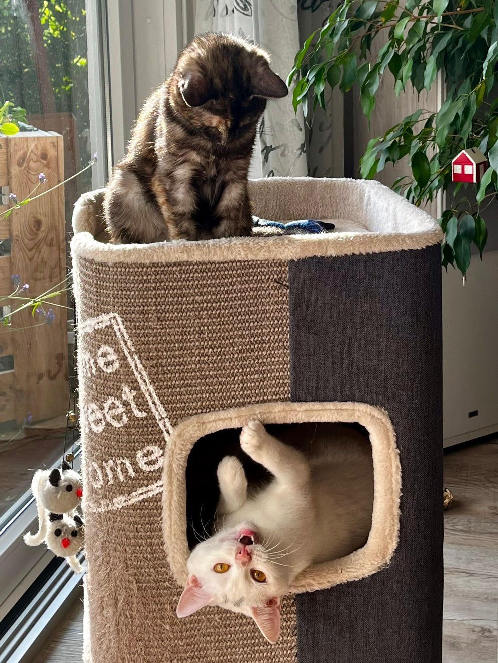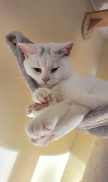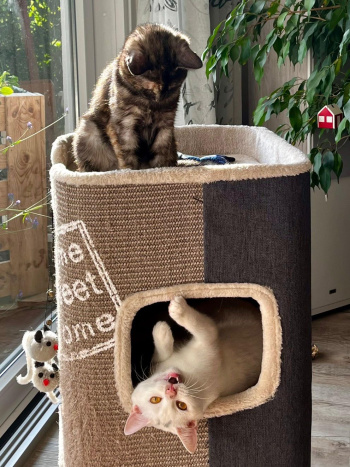 Die erste Zeit in meinem neuen Zuhause war ein bisschen schwierig. Es gab da schon ein kleines freches Katzending, namens Käthie. 4 Wochen älter als ich, kam von einem Bauernhof. Ich weiss gar nicht, was die sich eingebildet hat. Ich wollte doch die First Lady sein. Doch nach kurzer Zeit wurden wir Beide beste Freundinnen und nun gibt es halt 2 Prinzessinnen im Haus. Eine meiner Lieblingsbeschäftigungen ist, Käthie über den Kopf zu lecken, nachdem wir uns gegenseitig durchs ganze Haus gejagt haben. Nachts dekorieren wir gemeinsam das Wohnzimmer um, was auf dem Tisch liegt und steht , muss auf den Fußboden usw.