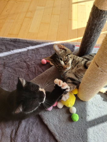 Seit wir in unser neues Zuhause gezogen sind, geht es uns hervorragend! Wir toben durch die Zimmer, jagen Spielzeug (und manchmal auch uns gegenseitig), schlafen in den unmöglichsten Positionen und entdecken jeden Tag etwas Neues. Inzwischen haben wir unsere Kastration und die ein oder andere damit einhergehende Komplikation gut weg gesteckt und sind wieder fit und munter! Den Tierarzt kennen wir jetzt schon richtig gut und wir verhalten uns da unglaublich vorbildlich - das haben wir ja jetzt geübt. Außerdem sind die Menschen da immer ganz entzückt von uns... wie könnte man das auch nicht sein? Schaut mal in den Anhang: Wie süß sind wir denn?!