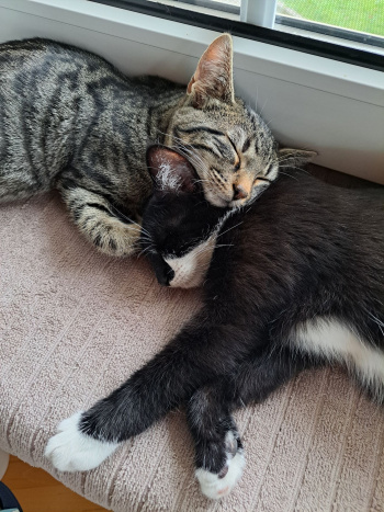 Unser allergrößtes Glück zeigt uns, wie man das beste Katzenleben lebt: unser großer Bruder. Schon seit Tag eins sind wir ganz und gar verliebt in ihn! Wir sind inzwischen ein unzertrennliches Trio – spielen zusammen, kuscheln zusammen und geben aufeinander acht. Dank euch musste er nach dem Verlust seines Bruders nicht allein bleiben, und wir könnten uns keinen besseren großen Bruder wünschen!❤️