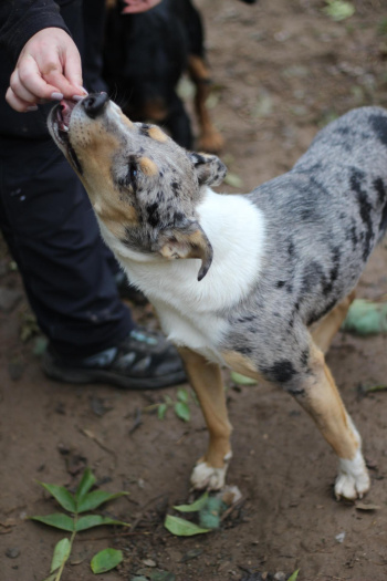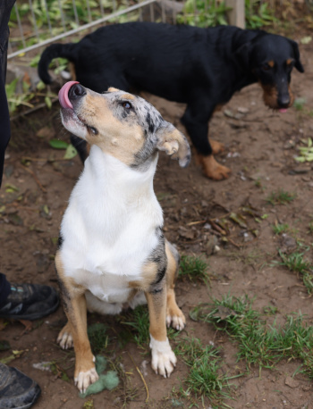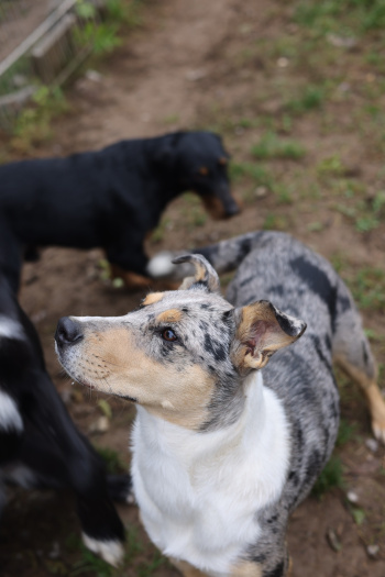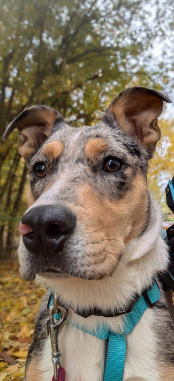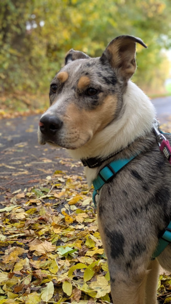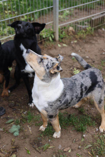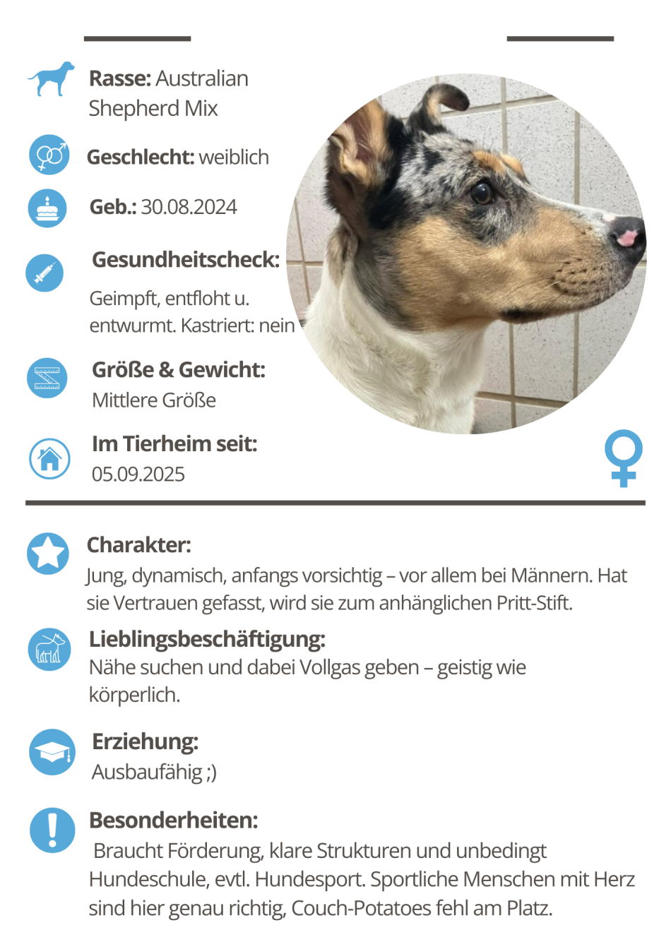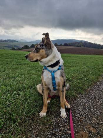 Was ich mir wünsche? Ein Zuhause, in dem Action und Kuscheln Hand in Pfote gehen. Hundeschule klingt für mich nach einem Abenteuer – Tricks lernen, mit anderen Hunden abhängen und zeigen, wie schlau ich bin. Und auch Sport finde ich echt super! Ob Agility, Frisbee, Joggen oder Wandern – Hauptsache wir haben gemeinsam Spaß! Ich bin quasi wie ein Fitness-Abo, nur flauschiger und mit Knopfaugen. Wenn du also zur Kategorie “Couch-Potatoes” gehörst, den ganzen Tag nur Netflix schaust und Chips futterst, wird aus uns nix! Klar können wir auch gerne zusammen chillen und meine täglichen Kuscheleinheiten brauche ich natürlich auch - aber bitte erst, nachdem wir uns so richtig ausgepowert haben! Ich hab richtig Lust drauf, gefördert zu werden, denn in mir steckt nicht nur verdammt viel Energie, sondern ich habe auch richtig was in meinem hübschen Kopf.