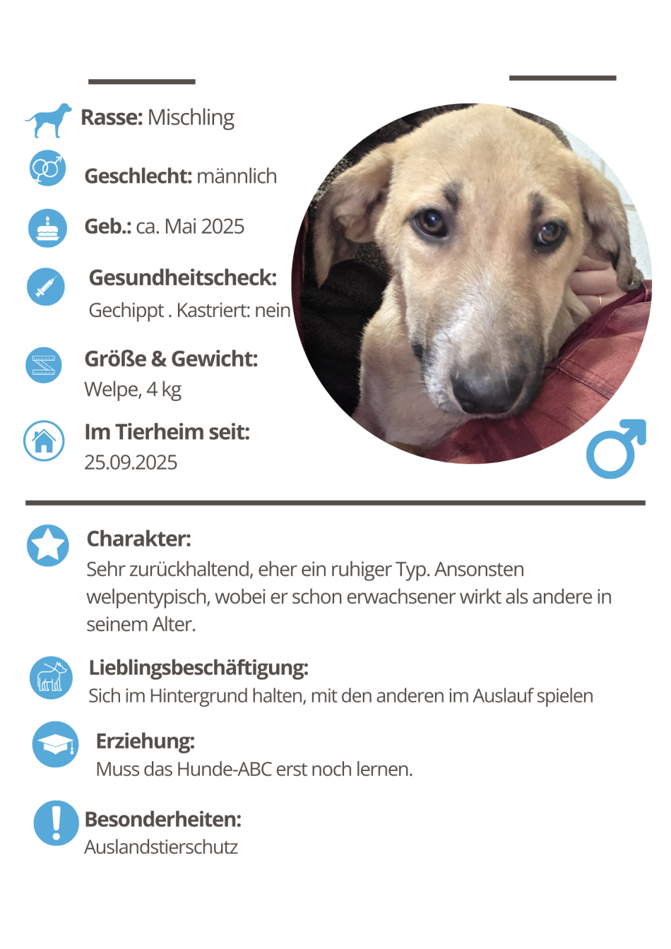 Obwohl ich noch nicht mal ein halbes Jahr alt bin, habe ich also schon einiges erlebt und auch vieles gesehen. Vielleicht liegt es daran, dass ich kein Draufgänger bin - eher ein ruhiger Typ. Ich bin zwar tief drin sehr neugierig, aber ich beobachte lieber (ja, manchmal auch mit einem etwas skeptischen Blick) und denke immer erstmal drüber nach, ob es sich überhaupt lohnt, dreckige Pfoten zu riskieren. Manche hier finden sogar, dass ich, im Vergleich zu anderen in meinem Alter, schon vergleichsweise “erwachsen” wirke. Naja, sagen wir mal so: Ich brauche halt nicht ständig Rambazamba und Spektakel, auch wenn natürlich trotzdem ab und zu meine welpigen Momente habe, in denen ich einfach gerne spiele oder mit den anderen draußen im Auslauf tobe. Eine gute Mischung aus Chillen und Spaß ist genau mein Ding! Deshalb bin ich auch echt froh, dass ich hier in Wildungen die Chance auf ein richtiges Leben bekommen habe: Hier darf ich Schritt für Schritt langsam ankommen, das ist genau das, was ich brauche. Menschen, die mich ruhig ansprechen und keinen Stress ausstrahlen, haben sofort einen Stein bei mir im Napf!