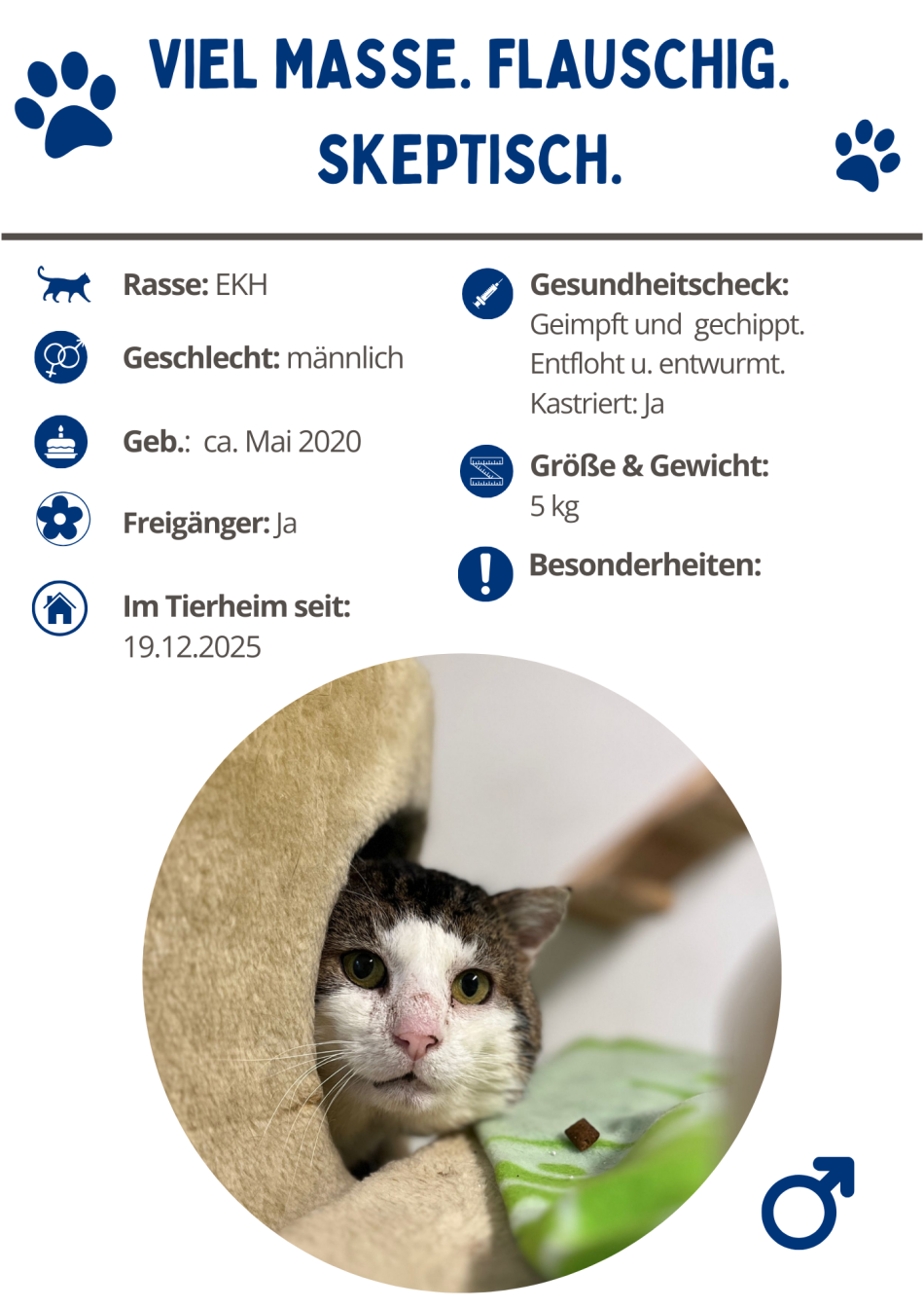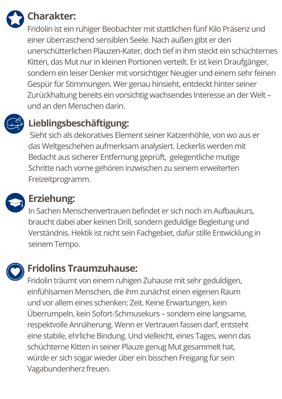 Und wenn ich dann – irgendwann – über mich hinauswachse, was bei meiner Körpermasse durchaus beeindruckend wäre, dann könnte ich mir durchaus vorstellen, eine freundschaftliche Beziehung zu „meinem“ Menschen aufzubauen. Eine mit gegenseitigem Respekt. Und wer weiß, vielleicht später sogar wieder mit Freigang. Ein bisschen Vagabundenleben 2.0! Dann könnte aus dieser schüchternen Höhlendekoration ein echter Gefährte werden. Einer, der Bindung nicht leichtfertig verteilt, aber wenn, dann ehrlich. Bis dahin bin ich Fridolin. Auf der Suche nach Menschen, die verstehen, dass man fünf Kilo Vertrauen nicht erzwingen kann. Und der, wenn es ganz still ist, davon träumt, dass er draußen wieder der Boss ist.