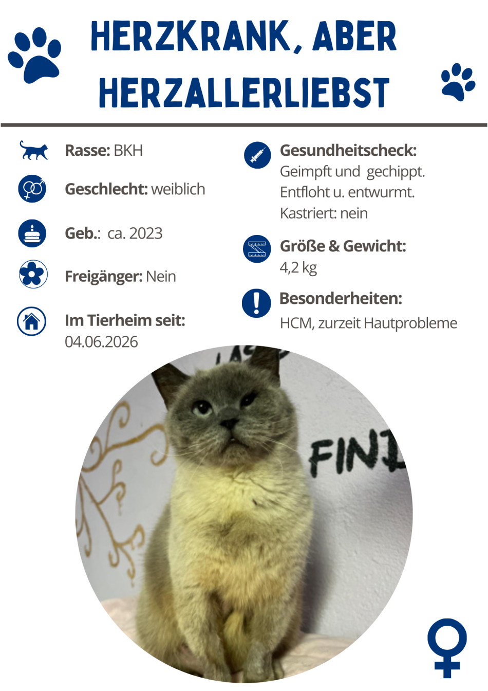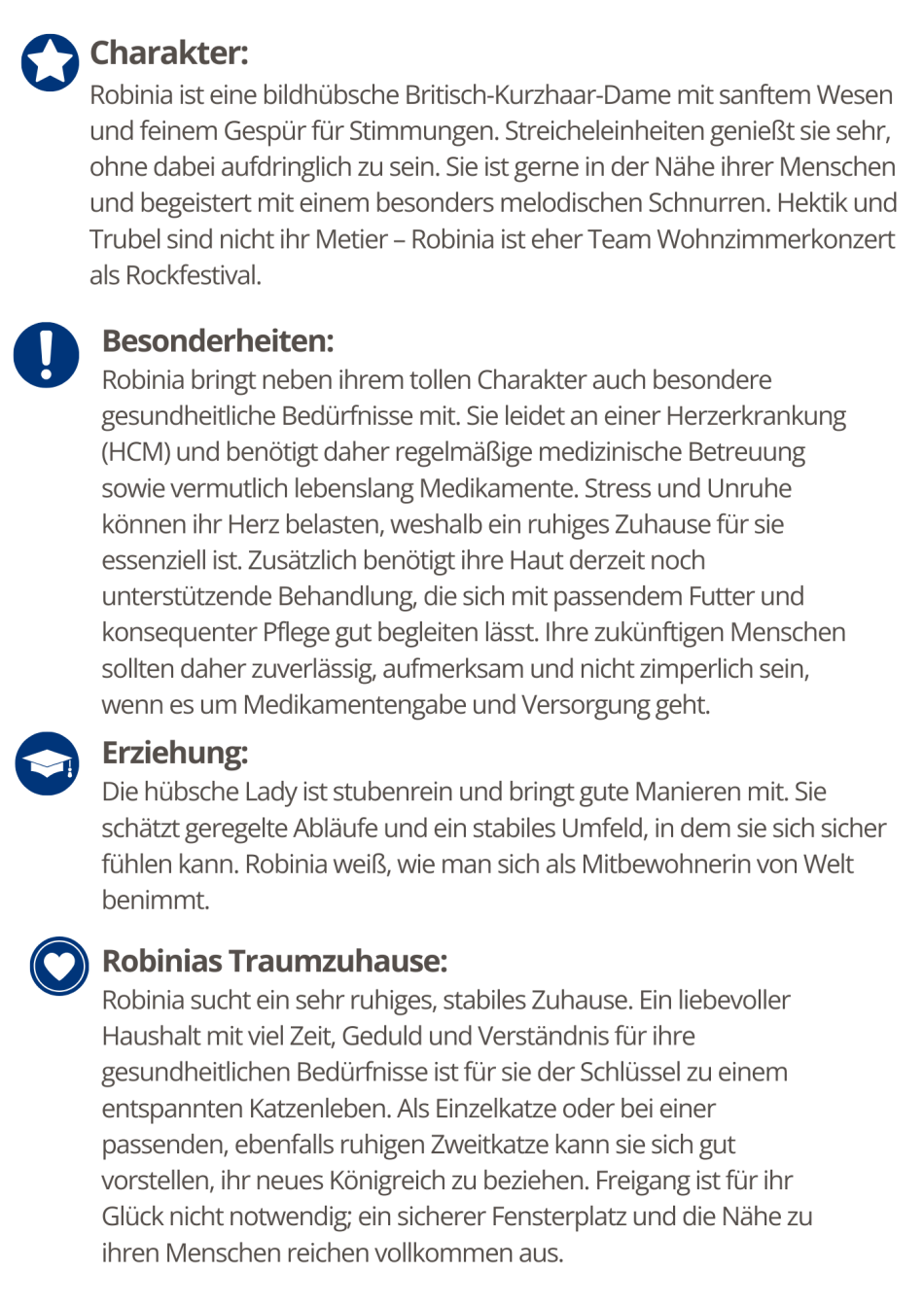 Ich bin eine ruhige Genießerin, liebe Streicheleinheiten und deine Nähe. Ich werde nicht dein Haus auf links drehen, sondern dein Herz. Wenn du also keine Angst vor intensiver VIP-Betreuung inklusive medizinischer Fürsorge hast, dann verspreche ich dir: Ich schenke dir Vertrauen, Zuneigung – und das wohl schönste Schnurrkonzert deines Lebens.
