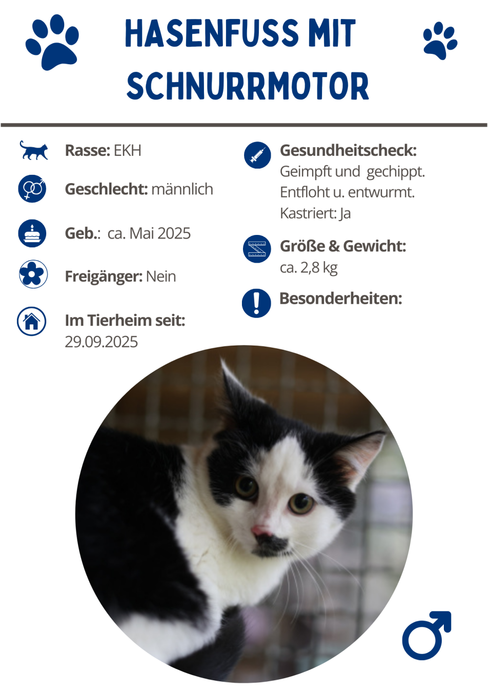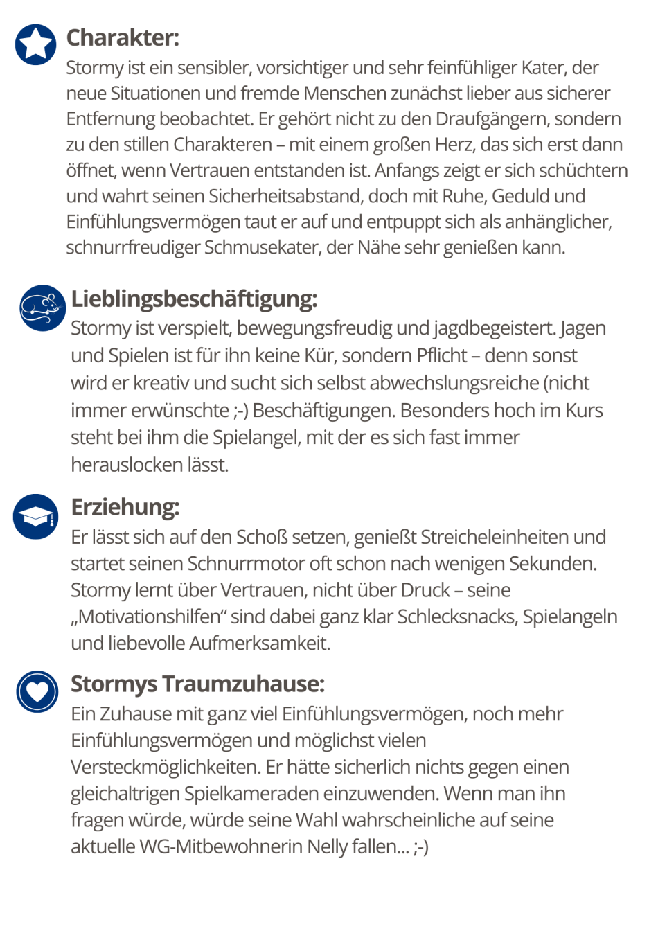 - Stormy: Es gab Zeiten, da habe ich geschickte Ausweichmanöver in Perfektion beherrscht, aber pssst: Meine Pflegemama sagt, ich brauche einfach nur Zeit, Schlecksnacks und eine Spielangel, um meine Deckung aufzugeben. Was mir viele nämlich gar nicht zutrauen: Ich bin mit einem gut funktionierenden Schnurrmotor ausgestattet, der sich allerdings nur mit eine ordentlichen Portion Einfühlungsvermögen aktivieren lässt. Aber wenn es erstmal soweit ist, vibriere ich auf deinem Schoß wie ein kleiner Traktor, wirst sehen!