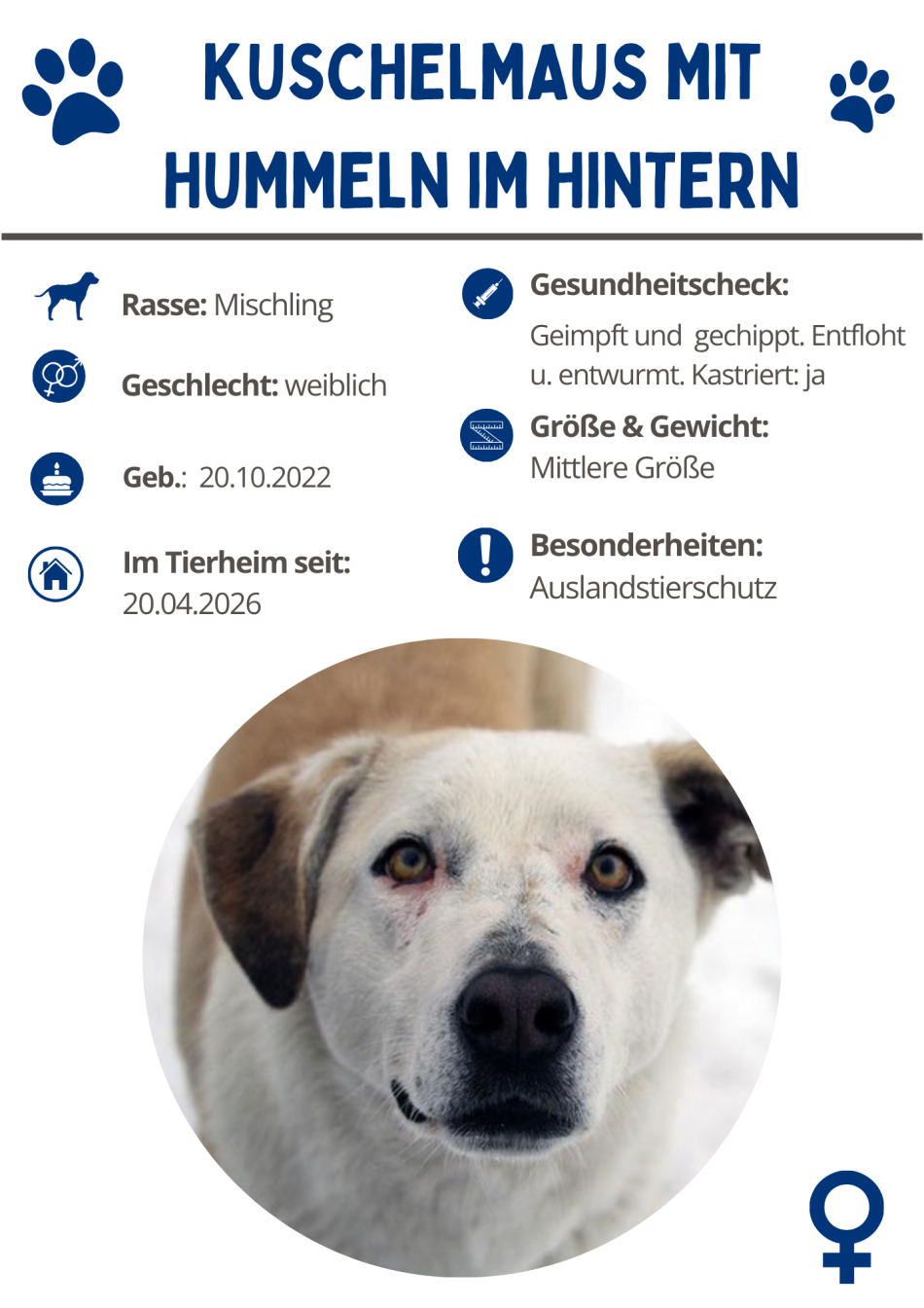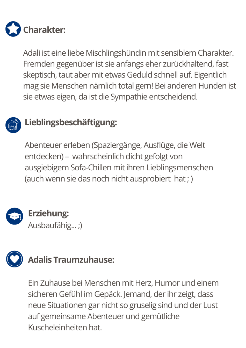 Was ich mir für meine Zukunft wünsche? Ein Zuhause, in dem ich ankommen darf. Menschen, die mir Sicherheit geben, mir Zeit lassen und Lust haben, mit mir gemeinsam die Welt zu entdecken – draußen ein bisschen Abenteuer, drinnen ganz viel Sofa. Ich bin bereit für Spaziergänge, gemeinsame Erlebnisse, ruhige Abende und ganz viele Kuscheleinheiten.