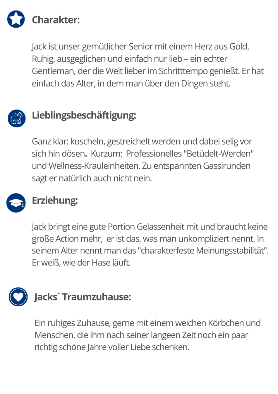 - Der Charakter: Ich bin die Ruhe selbst. Während die jungen Hüpfer hier im Tierheim wegen jeder vorbeifliegenden Blaumeise Eskalation üben, genieße ich lieber das Hier und Jetzt. Stress? Kenn ich nicht. Ich mag´s gemütlich - ich bin ein echter Gentleman, der die Welt mittlerweile lieber im Schritttempo genießt. Irgendwann kommt man halt einfach in das Alter, wo man über den Dingen steht. Ansonsten würde ich mich als ausgeglichen und lieb beschreiben - mit einem echten Herz aus Gold, das noch ganz viel Liebe zu verschenken hat. Einfach ein unkomplizierter Klassiker, perfekt ausgereift.