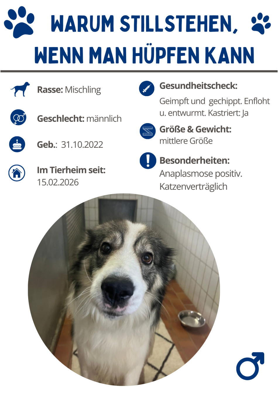 Huhu, ich bin Linus! 3,5 Jahre alt, gut aussehend, sportlich - manche nennen mich auch Flummi. Wenn das Leben eine Hüpfburg wäre, wäre ich ihr König. Die Zweibeiner hier im Tierheim sagen, ich hätte sowas wie „eingebaute Sprungfedern“. Ich nenne es: Maximale Lebensfreude! Wenn ich mich freue, hüpfe ich. Wenn ich aufgeregt bin, hüpfe ich. Wenn mir irgendwas komisch vorkommt… naja, ihr ahnt es. Warum sollte ich auf vier Pfoten stehen, wenn ich die Welt auch aus der Känguru-Perspektive sehen kann? Außer natürlich, jemand sagt mir klar und deutlich, dass jetzt Feierabend ist (und das machen die hier gerade ständig!) – dann kann ich auch mal drei Sekunden stillsitzen, als wäre nie was gewesen. Also manchmal. Und auch nur, wenn es unbedingt sein muss. Du merkst schon, ich brauche jemanden, der die Regie übernimmt. Ich spiele die Hauptrolle, du führst Regie – Deal?