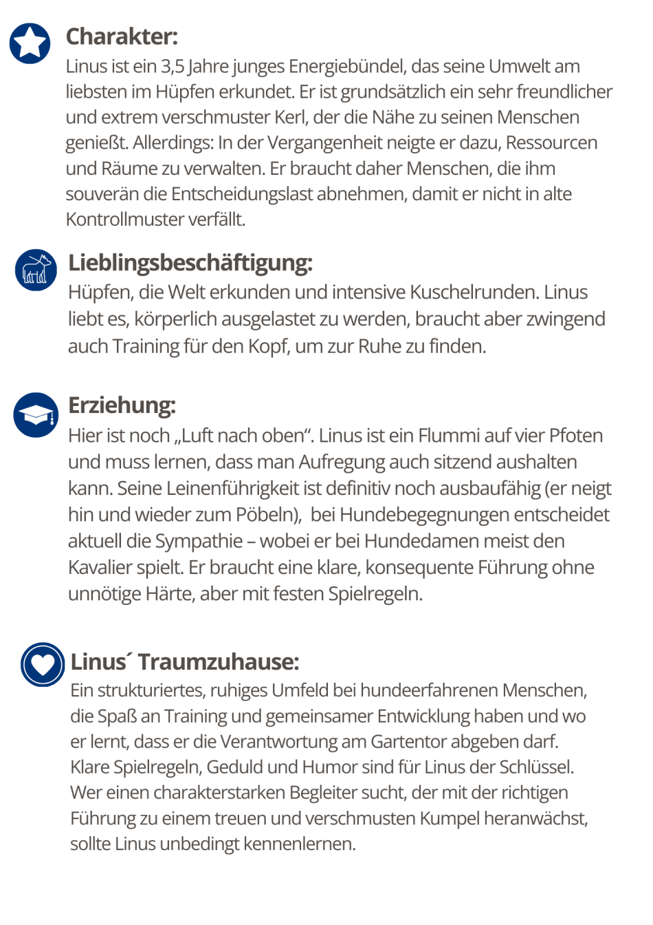 Ich bin kein Anfängerhund – ich bin ein Charakterkopf mit Kuschelfaktor. Wer Lust auf Entwicklung, Bewegung, Lachen und ganz viel Hund hat, bekommt mit mir einen echten Kumpel.