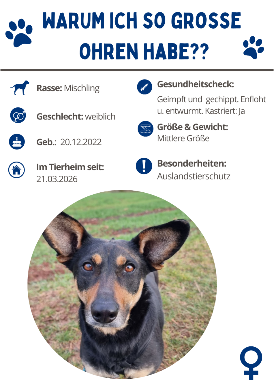 Neben einem liebevollen Zuhause suche ich also Menschen, die kein Problem damit haben, dass ihr Hund eventuell Radio-Signale aus dem Weltall empfängt. Ich verspreche auch feierlich, dass ich meine Ohren zumindest immer in deine Richtung drehe, wenn du irgendwas sagst. (Vor allem, wenn es um Leckerchen geht!). Ob ich dann auch wirklich höre, ist ein anderes Thema - darüber können wir bei einem leckeren Leberwurst-Snack demnächst aber gerne mal ausführlicher sprechen. Also, komm mich doch mal besuchen – ich höre dich kommen!
