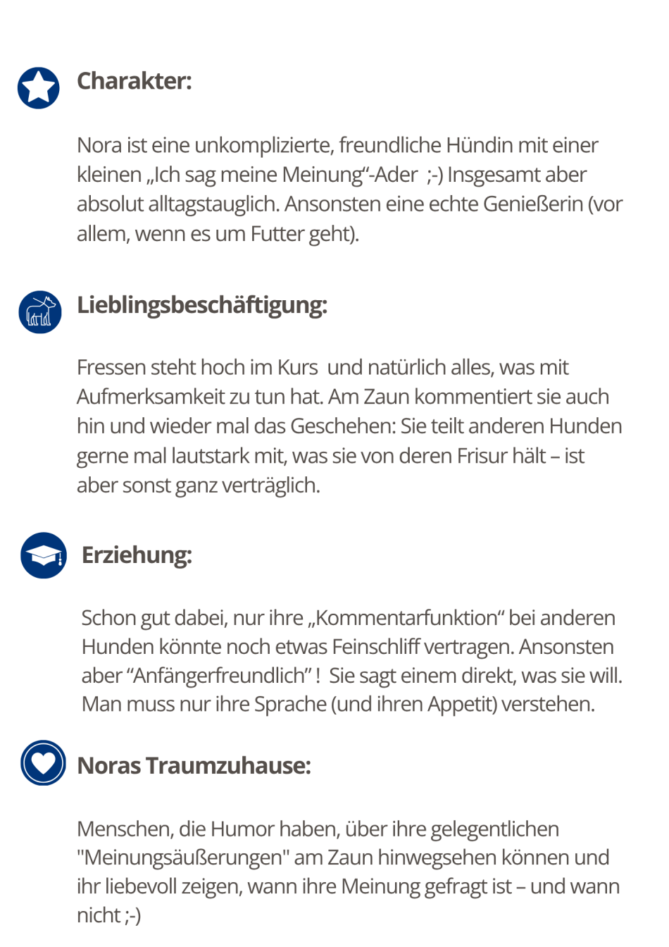 Was du sonst noch über mich wissen musst? Hmm, gar nicht mal so viel. Unkompliziert ist nämlich mein zweiter Vorname: Ich bin quasi ein "Rundum-sorglos-Paket" - bei mir brauchst du keine seitenlange Bedienungsanleitung! Alles, was ich möchte, ist einfach nur ein bisschen Liebe, ein voller Napf, ausgiebige Streicheleinheiten (wie gesagt, ich bin eine echte Genießerin!) und zwischendurch natürlich auch mal schöne Gassirunden - am liebsten übrigens mit dir!