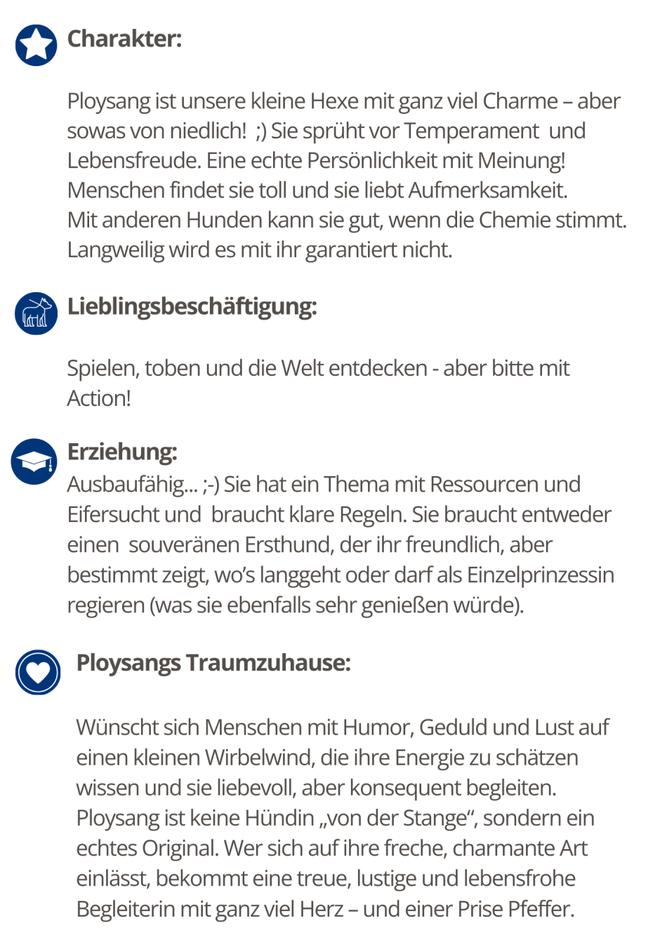 Zusammengefasst bin ich ein lebensfroher, verspielter, aufgeschlossener Schatz mit ordentlich Pfeffer, einem kleinen Dickkopf und ganz viel Charme. Oder, um es im Ploysang-Stil auszudrücken: Ich bin ein kleiner, noch ungeschliffener Edelstein mit ordentlich Glanz, Temperament und Charakter. Manchmal ein bisschen frech, manchmal sehr charmant – aber immer ich selbst und immer mit eigenen Vorstellungen. Ich bin halt keine Ploysang von der Stange, sondern ein echtes Original! Fakt ist: Mit mir wird das Leben niemals langweilig.