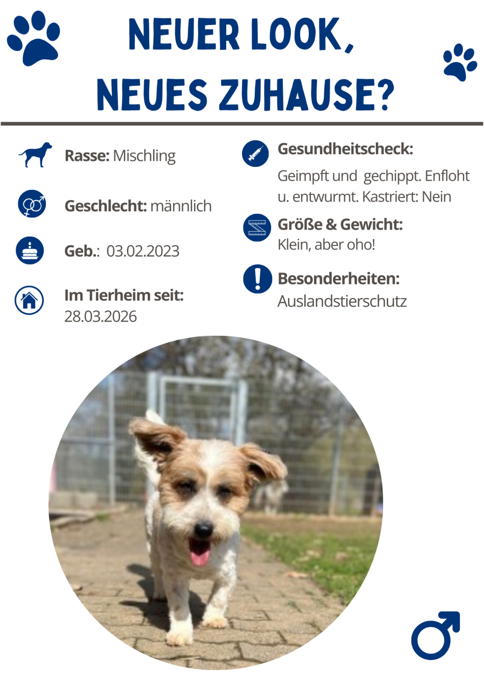 Ich bin zwar erst seit Kurzem hier im Tierheim, aber ich habe den Laden schon voll im Griff. Seien wir doch mal ehrlich: Ich bin der heimliche Star auf dem Hundeflur! Ich werte einfach jeden Raum sofort mit meiner Anwesenheit auf. Als kleiner, charmanter Macho weiß ich natürlich, wie man die Zweibeiner um die Pfote wickelt. Ich bin extrem menschenbezogen – was wohl daran liegt, dass ich einfach ein verdammt guter Typ bin, mit dem man gerne Zeit verbringt. Andere Hunde finde ich übrigens auch völlig okay, solange sie akzeptieren, dass ich hier das heimliche Model bin.