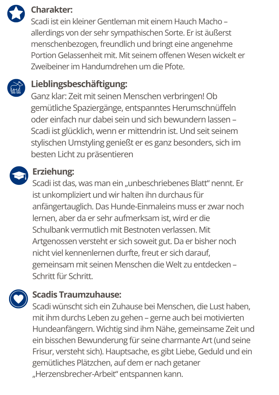 Ich bin unkompliziert, freundlich und eigentlich für jeden Spaß zu haben. Dass ich noch nicht viel kenne? Geschenkt! Das bisschen Sitz, Platz und Fuß lerne ich mit links, solange die Gage in Form von Leckerlis stimmt. Dafür bin ich ein Mann von Welt! Drei Jahre jung, internationaler Herzensbrecher, aus Rumänien angereist und jetzt bereit, hier ordentlich Eindruck zu machen. Und ja, ich weiß ziemlich genau, wie gut ich aussehe. Ich sag´s euch, wenn Charme ein Beruf wäre, hätte ich längst Karriere gemacht!