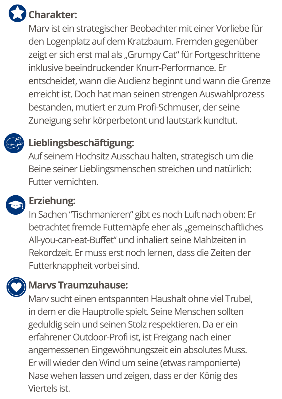 Ich suche jetzt also Menschen, die cool genug sind, mich zu nehmen, wie ich bin. Die akzeptieren, dass ich der Boss bin, mir aber trotzdem den Bauch kraulen, wenn mir danach ist. Und eins ist klar: Wenn die Tür zu bleibt, gibt’s Ärger! Auch wenn ich dann ein Zuhause habe (was ich natürlich schon gern hätte), brauche ich Freiheit in den Schnurrhaaren und meine Streifzüge durch die Nachbarschaft - diesmal halt nur mit einem vollen Bauch und einem sicheren Sofa im Rücken. Den Rest regle ich. Ich suche mir meine Leute schon gerne selber aus. Wenn du also irgendwann merkst, dass ein roter Kater plötzlich an deinen Beinen klebt … dann Glückwunsch. Du wurdest von Marv ausgewählt!