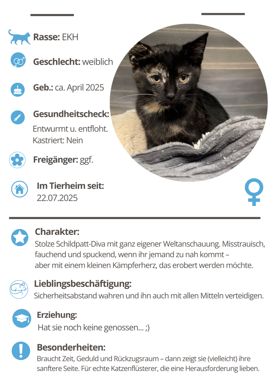 Tag zusammen, mein Name ist Nelly. Ich bin eine Schildpatt – und falls du nicht weißt, was das heißt, lass es mich dir kurz erklären: Mein Fell ist auffällig bunt - und dasselbe gilt auch für meinen Charakter! Eigensinnig, temperamentvoll und geradlinig. Man könnte auch sagen, dass ich schlicht und einfach was ganz Besonderes bin! Ich weiß eben, was ich will und vor allem, was ich nicht will. Manche nennen es „eigenwillig“, ich nenne es die einzig wahre Weltsicht. Einfach eine gute Mischung aus Stolz, Witz und Sturheit! Kurz gesagt: Ich bin klein (also noch), bunt und habe einfach eine ausgeprägte Persönlichkeit - und davon eine ordentlich Portion.