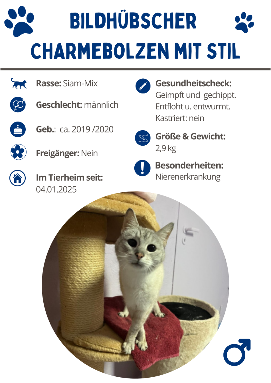 Ich bin ein Siam-Mix, was bedeutet: Ich sehe nicht nur verdammt gut aus, ich habe auch eine Meinung zu allem. Und ich liebe Aufmerksamkeit. Ganz viel Aufmerksamkeit. Man könnte sagen, ich bin ein echter Gute-Laune-Kater. Lebensfroh, sozial und absolut menschenbezogen. Ich mag Gesellschaft – und zwar am liebsten rund um die Uhr. „Privatsphäre“ ist für mich eher ein gut gemeinter Vorschlag als eine Regel. Soll heißen, dein eigener Schatten kann getrost in Rente gehen - du hast jetzt einen neuen! Ich bin lieber mittendrin, statt nur dabei - denn ganz ehrlich, einer muss ja schließlich beaufsichtigen, was du so treibst! ;-)