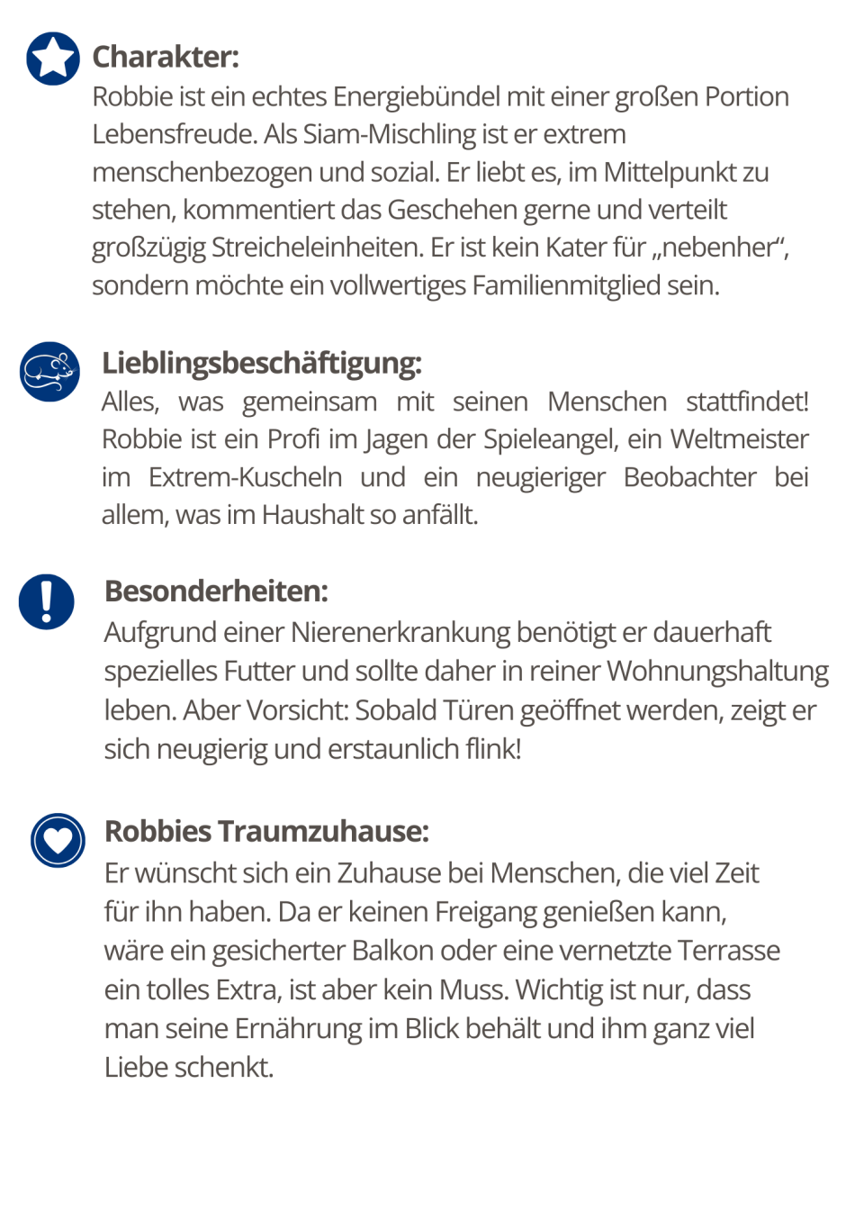 Gestatten? Robbie. Ich bin quasi das Upgrade für dein Sofa. Wie ich im Tierheim gelandet bin? Schwamm drüber, tut eigentlich nichts zur Sache, nur so viel: Offensichtlich hatten meine früheren Besitzer keine Ahnung von wahrer Ästhetik. Aber ich bin kein Kater für Trübsal – ich bin einer für Neuanfänge. Vergangenheit? Abgehakt. Jetzt wird nach vorne geschnurrt!