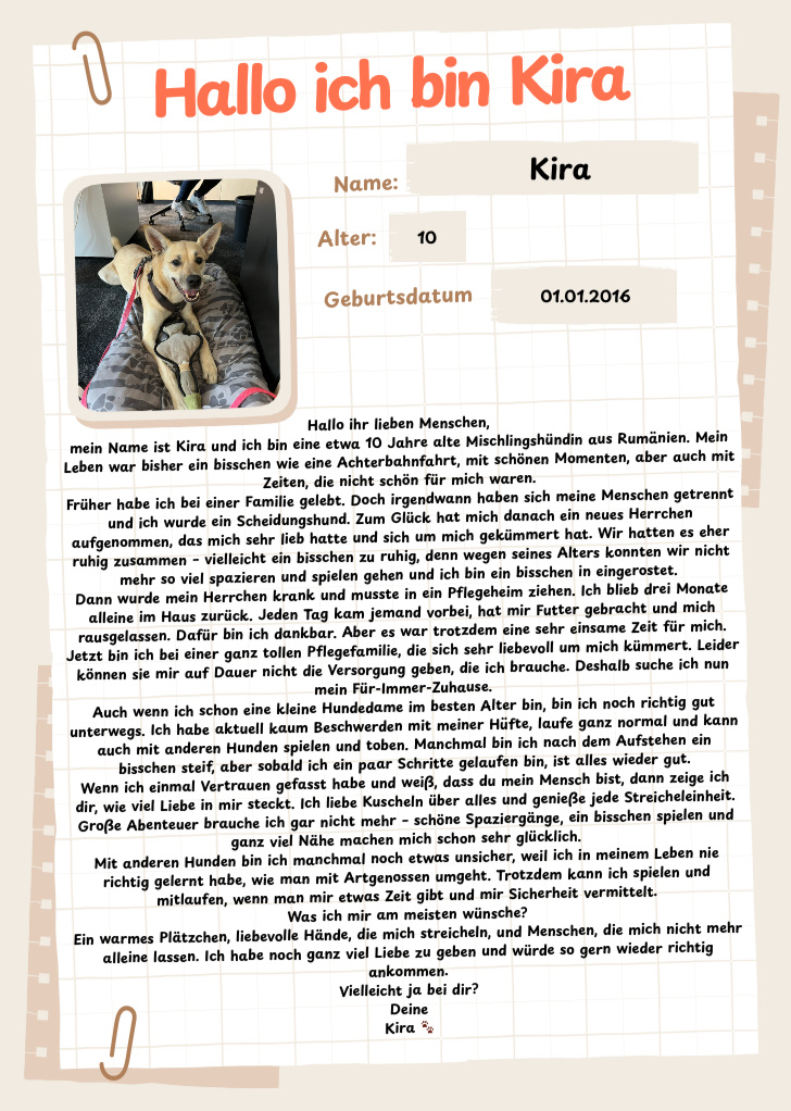 Sie ist ein Mischling, vermutlich mit Anteilen eines Herdenschutzhundes. Deshalb wünschen wir uns für sie ein hundeerfahrenes Zuhause, das ihre Eigenschaften versteht und sie liebevoll und souverän begleitet. Nach einer Eingewöhnungszeit würde ihr auch geistige Auslastung sehr guttun, und eine Unterstützung durch einen Hundetrainer wäre sehr willkommen.